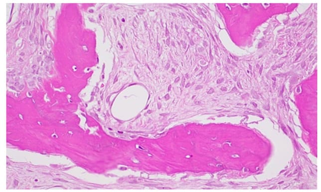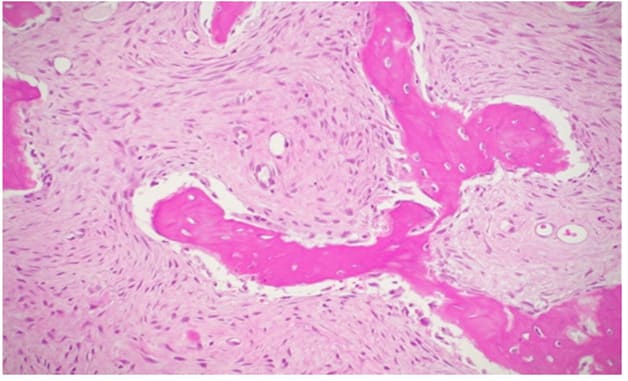 Figure 13: H&E 400X 4, fibroblastic stroma with spindle-shaped elements and the absence of osteoblastic rim.