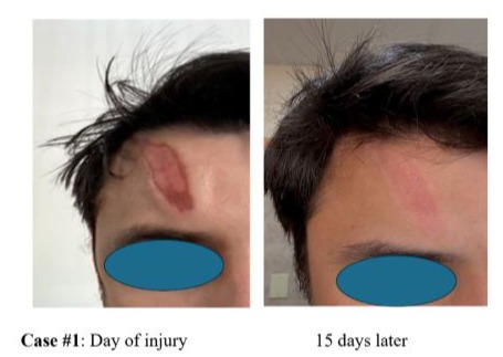 The subject was a 27-year-old man who sustained a traumatic abrasion to the forehead, just above to the right eyebrow, upon impact with the steering wheel during a car accident. Following written informed consent, the volunteer received training by the Neobiosis clinical team for supervised, topical self-application of ViX001 to the affected area [3].