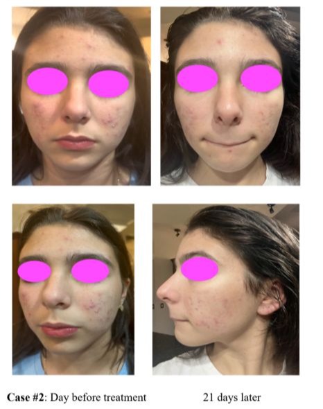 The volunteer and both parents provided a written informed consent. Acne lesions were primarily distributed across the forehead and bilateral cheeks, with relative sparing of the nasal region. Despite previous use of various conventional therapies, her acne had remained unresponsive, significantly affecting her wellbeing and participation in school activities, including theatre and vocal performance that she enjoyed before the onset of her acne.