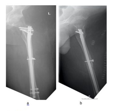 The patient was placed on a radiolucent table in supine position without traction. The operation was performed under spinal anesthesia. The dislocated proximal wedge fragment measured 7 x 1cm. We decided to fix this by means of a cable cerclage (Cable System, DePuySynthes, Oberdorf, Switzerland) in a minimal invasive technique without stripping the periosteum. A non-displaced wedge fragment was also fixed by means of a cable cerclage. Special attention was paid to bringing the nail in the exact longitudinal axis of the femoral shaft.Intraoperative fluoroscopy showed anatomic reduction and stable fixation (Figure 2a, b).