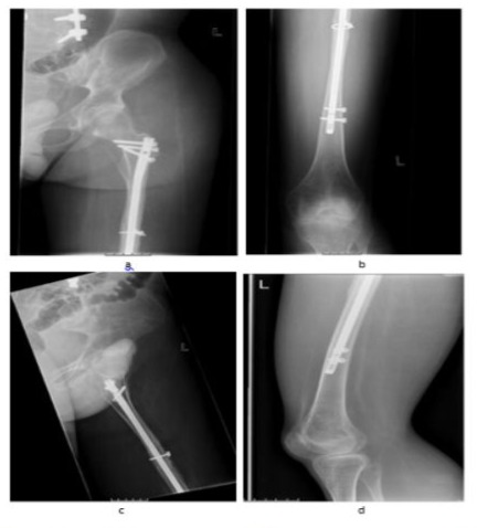 Figure 3a-d: Follow-up composed X-rays after 12 weeks. All cortices are bound by callus formation in a.p. (Figure. 3a,b) and lateral (Figure. 3c,d) views.