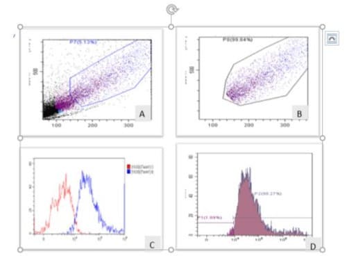Figure-2A,B,C & D: In-vitro 5-Azacytidine showing mix and pure CTCs population of EpCAM after gating (fig. 2A& B). Graphically represents total cell population +ve EpCAM (blue) and –ve EpCAM (red) as shown in fig. 2C. Histogram showing frequency of + EpCAM (98.27 %) cell population (fig.2D) with decrease trend significantly, when compare with controls due to cytotoxic nature of the drug.