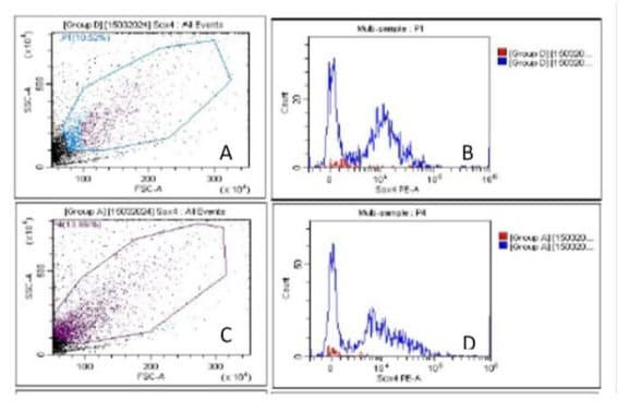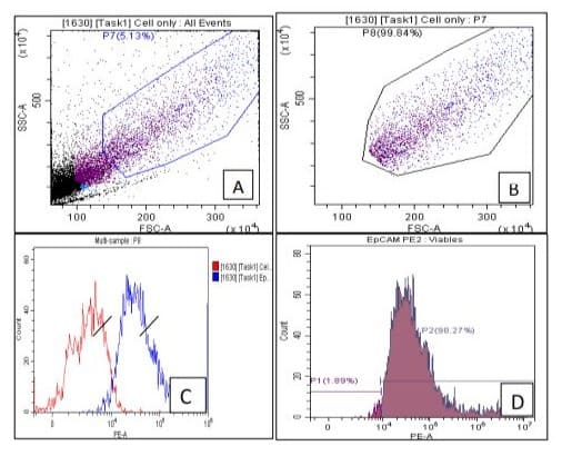 Sox4 (B-7) PE Lot # B2420, Catalog No sc-518016 monoclonal conjugated antibodies is used to detect intra cellular antigen (Santa Cruz Biotechnology USA). EpCAM PE (REF 12-579182, Lot 2384305) monoclonal antiMo-CD326 was purchased from Thermo fisher (USA) for extra cellular detection of antigen. Cell were fixed and permeabilization buffer is used according to the protocol of the kit (PerFix-nc, Beckman Coulter, France). Staining procedures were strictly followed by the manufacture’s protocol and 50 ul of CTCs were stained with 200 µg/ml for Sox4 PE and 100 µg for EpCAM PE monoclonal antibodies and incubated for 60 minutes. Cell were fixed for 10 minute in 5 µl of Per Fix-nc buffer 1 followed by PerFix-nc buffer 2 and then add antibodies , incubated for 30 minutes wash two times with 3.0 ml of phosphate buffer and centrifuge at 1600 rpm for 5 minutes to remove excess amount of residues. Now cell were allowed to keep in permeabilization buffer 3 (1:10 dilution) and centrifuge at 1600 rpm , finally resuspend pellet in 500 ul of PerFix-nc buffer 3 and cells are ready for acquisition on flowcytometry.