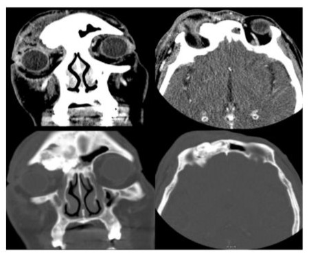 Figure 1: Axial and coronal CT scans showing frontal sinus osteoma with SPA