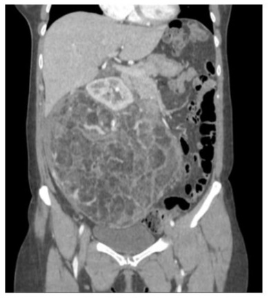Patient B was admitted to Internal Medicine ward for further investigation of a general syndrome and fever that had persisted for one month. A comprehensive study, including a body CT, revealed a voluminous left retroperitoneal mass up to 20 cm, suggestive of a renal AML, with large-caliber vessels inside and partial thrombosis of some of the more anterior veins.