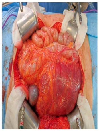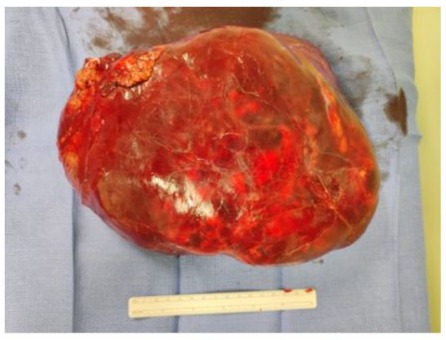 Due to the size of the lesion and the high risk of bleeding, an open partial nephrectomy was performed on patient A. A midline laparotomy exposed a large mass, which was excised under arterial clamping, with a total ischemia time of eight minutes (figure 3). The surgical specimen weighed 2480 grams (figure 4). The surgical procedure lasted 3 hours and two units of red blood cells were transfused afterwards. Peritoneal drainage was removed on 8th day, and patient was discharged.
