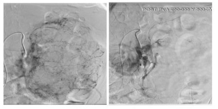 In patient B, the risk of surgical resection was found to be higher due to patient’s age and comorbidities. To reduce bleeding risk, selective embolization of tumor branches was successfully carried out (figure 5), with no adverse effects observed. Four months later, the lesion had decreased in size, so we performed an open partial nephrectomy due to the patient’s favorable general condition.