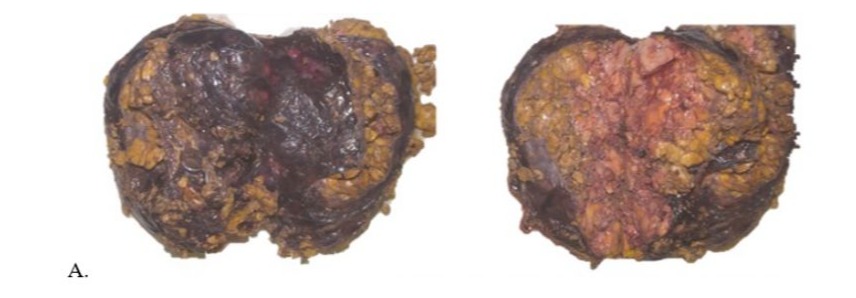 Figure 7: Main pathological anatomy findings. (A. Macroscopic study, B. Microscopic study, C. Immunohistochemical studies -actin and cytokeratin-)