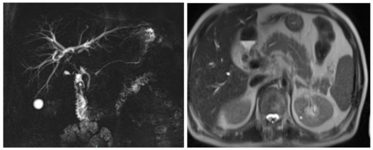 Figure 1(A and B): MRI showed Features suggestive of hilar periductal neoplastic pathology with obstructive biliopathy and focal inflammatory changes of the pancreatic head.