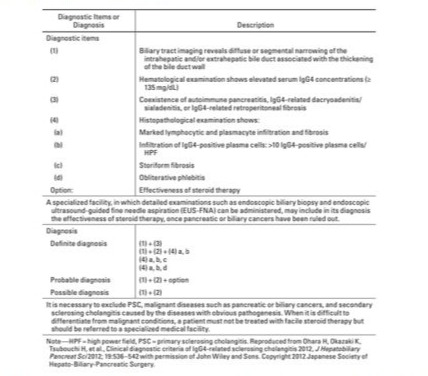 - Ohara H, Okazaki K, Tsubouchi H, et al. (2012) Research Committee of IgG4-related Diseases. Re- search Committee of Intractable Diseases of Liver and Biliary Tract; Ministry of Health, Labor and Welfare, Japan; Japan Biliary Association. Clinical diagnostic criteria of IgG4-related sclerosing cholangitis. J Hepatobiliary Pancreat Sci 19: 536-542.