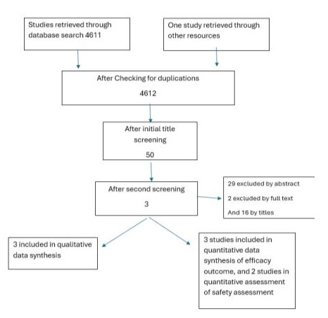The search was done in September 2024. Embase database searched through Ovid interface from 1946 to 24/September/2024. Considering the search keywords, a total of 4611 studies were retrieved. In addition to one study was obtained from Searching other sources. Initial screening was done for titles with one reviewer and chaton AI as second reviewer, then another screening process was done by another reviewer for titles, after that we end up with 50 studies, 47 was excluded as explained in table (1). The disagreements were resolved by consensus. Finally, considering the inclusion and exclusion criteria and after in-depth evaluation, three articles were selected for included in the analyses. Details of the process of screening and selection of articles are shown in figure (1).
