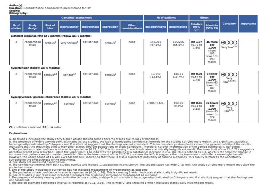 Overall completeness and applicability of evidence: Overall, this review provides a mixed assessment of the current evidence. While the treatment group had a slightly higher positive response rate, the uncertainty around the effect size and the lack of clinically meaningful differences limit the strength of the conclusions. Additional high-quality studies may be needed to further clarify the relative efficacy and safety of different corticosteroid regimens for the management of immune thrombocytopenia.