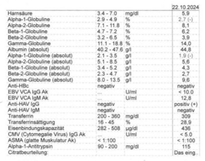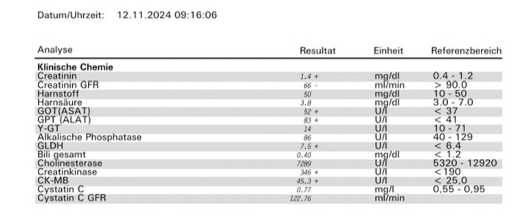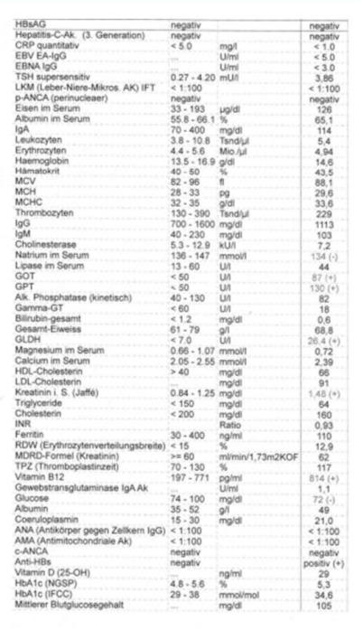Lastly, even fasting and dieting can be linked to increased creatinine values [23]. The next increased value is urea (in the table termed ‘Harnstoff’). Like before, this value is known to be increased after exercise [24]. The two increased values of AST and ALT follow the same pattern, that was already discussed in the introduction, showing increase in healthy, but active men. Especially interesting is to note, that the values, that did not experience an increase in the study, did not experience an increase in the subject, being bilirubin, AP and GGT [10]. The final value, different from the norm, is the glomerular filtration rate GFR. This could be explained by the fact that the fasting was interpreted as water-fasted. Therefore, it would be possible that the kidneys just ‘had nothing to filtrate’ [25]. Further, it is known that exercise can artificially decrease renal function, because the renal blood flow can decrease to as low as 25% [26]. However, because this value was concerning the most, another blood sampling took place.