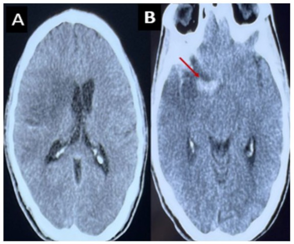 Figure 1: CT scan without contrast, axial section showing a right deep and superficial sylvian ischemic stroke with mass effect on the homolateral ventricles (A). Spontaneously hyperdense appearance of the right Sylvian artery (B).