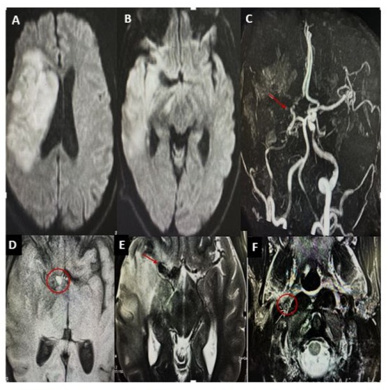 Figure 2: Brain MRI shows a right fronto-temporo-parietal hypersignal with mass effect on the ipsilateral ventricles (A–B). Magnetic resonance angiography (MRA) reveals total occlusion of the right middle cerebral artery (MCA) and hypoplasia of the right internal carotid artery (ICA) and the A1 segment of the anterior cerebral artery (C). A nodular formation, hypointense on T2-weighted images and hyperintense on T1-weighted images, is observed at the level of the carotid terminus (D–E). A hyperintense crescent on T2weighted imaging, consistent with an intramural hematoma, is also visible (F).