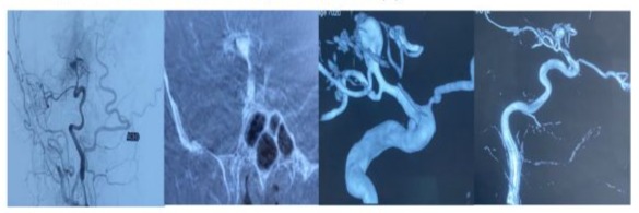 Figure 3: Three-dimensional angiography demonstrating pseudoaneurysmal dilation at the origin of the right sylvian artery with small caliber appearance of the internal carotid artery with spasms indicating the presence of vascular pathology in a drug user.