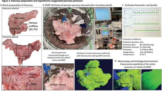 Methods: This study includes first, a literature review on the evolution of cold and warm pancreas machine perfusion strategies. Second, pressure-controlled hypothermic oxygenated perfusion (HOPE, pO 2>60kPa) with fluoresceine is performed in porcine pancreases.