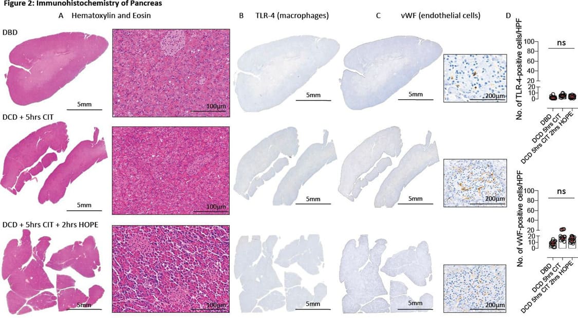 The histological assessment demonstrated no signs of ischemic necrosis or congestion, minimal macrophage activation and inflammation at the end of 2hrs HOPE compared to low risk, baseline control DBD organs (Figure 2). The known dilatation of the peripheral vasculature was also seen here after HOPE of the pancreas (Figure 2A). This phenomenon was described earlier in other organs, e.g., livers or kidneys. With the need to completely preserve the entire periphery of this specific gland to reduce IRI-associated inflammation, this finding is of particular interest also in context of the here applied lower perfusion pressure of maximal 20mmHg during HOPE. No significant differences were observed regarding the number of proinflammatory tissue macrophages and endothelial cells throughout the study groups (Figure 2D).