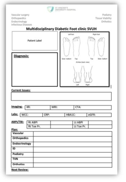 Diabetic foot disease is a complex multifactorial pathology that is constitutes a large burden for both patient and physician and places a substantial burden on the patient’s family, and service providers [1]. St. Vincent’s University Hospital (SVUH) is a 600-bed tertiary referral center. Vascular services receive referrals from the local catchment area in South Dublin in addition to the 4 peripheral referring hospitals serving a total population of 1.1 million. This leads to a large number of daily referrals of patients with diabetic foot disease. Management of this large population of diabetic patients has proved challenging in terms of coordinating in-patient and follow-up out-patient care in a multi-disciplinary setting. The International Working group on Diabetic foot Guidelines (IWGDF) in 2023 have emphasized on the importance of interdisciplinary foot care clinics in reducing the risk of major and minor diabetesrelated lower extremity amputation [1]. Previous experience with establishing a multi-disciplinary diabetic foot clinic in St. Vincent’s University Hospital proved helpful in establishing this new venture. The teams include Vascular surgery, Infectious disease (ID), Endocrinology, Outpatient Parenteral Antimicrobial Therapy (OPAT), Podiatry, Tissue viability, Vascular Advanced Nurse Practitioner (ANP) and Orthotics.