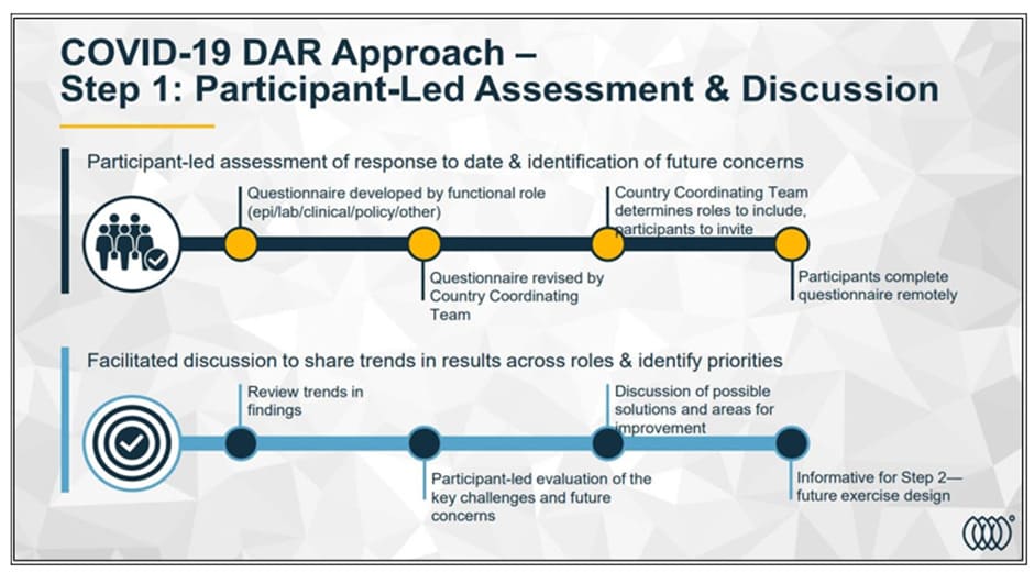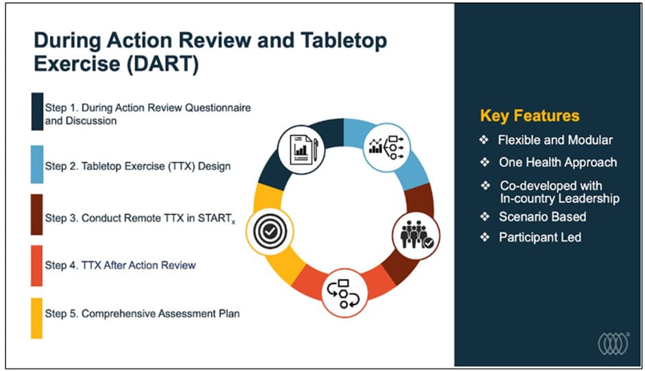 The During Action Review and Tabletop (DART) exercise methodology1 was conducted from November 2020-January 2021 using a participatory approach to assess COVID-19 response across multiple sectors and disciplines: Case Management & Countermeasures, Travel/ Point of Entry, Emergency Response and Communication, Epidemiology & Laboratory, Animal Health, and Overall Coordination. DART begins with a review of the response to date to allow for retrospective evaluation of readiness which informs the development of scenarios for an exercise to test resiliency to future challenges. DART empowers participants to identify their priority needs and gaps through using participant-led analysis techniques. The multiplayer, transdisciplinary design of DART scenarios is uniquely suited for multisectoral exercises. Unique exercise scenarios and information flow are designed to mimic real life scenarios. For example, Livestock ministry officials only receive data about animal health, while point of entry officials tackles scenarios at an airport and epidemiology and laboratory address scenarios focusing only public health. Participants are advised to share information only if they would do so during a real-life situation, allowing for assessment of information sharing.