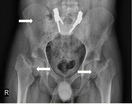 Figure 1: XRAY of the pelvis and hips demonstrating bilateral coxa vara with subcapital fracture of the right femur. Bilateral pedicle screw hook fixation can be observed due to the treatment of bilateral spondylolysis.