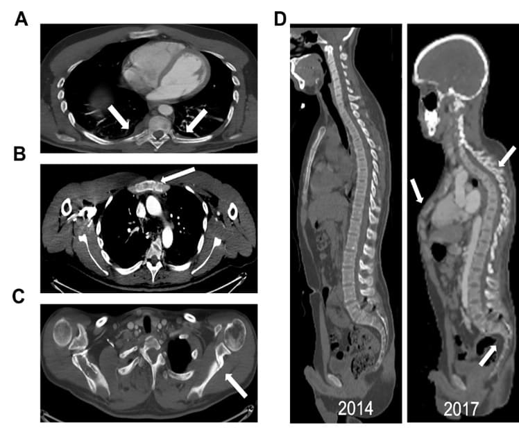 Figure 2: A. Axial CT demonstrating fractures (looser zones) of the posterior aspects of bilateral ribs. B. Axial CT demonstrating fracture (looser zone) of the manubrium sterni. C. Axial CT demonstrating fracture (looser zone) of the left scapula. D. Sagittal CT demonstrating dynamic changes and appearance of severe pectus carinatum with thoracic and sacral kyphosis.