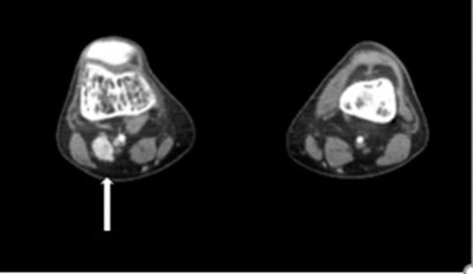 Figure 3: CT with IV contrast injection demonstrating enhancement of a small soft tissue mass in the popliteal fossa of the right knee, located adjacent to the lateral aspect of the popliteal vessels and the tibial nerve and medial to the common peroneal nerve.