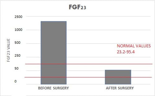 Figure 4: Graphical correlation of the FGF 23 values pre- and post- surgery, with an immediate normalization of the values between 23.2-95.4 RU/ml after surgery.