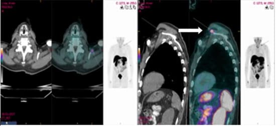 Figure 5: 68Gallium DOTANOC PET/CT demonstrating a small soft tissue nodule with pathologic uptake situated adjacent to the superoanterior aspect of the coracoid process (arrow).