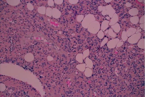 Figure 7: Microscopic pathological view of the tumor, displaying fat tissue with proliferation of bland spindle cells, numerous blood vessels, amorphous matrix deposition and several calcifications without atypia or mitosis.