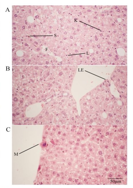 Figure 1: (A-C) H&E stained PCTRL liver sections showing infiltration of lymphocyte (L), macrophage (M) and leukocyte (LE) into alcoholic liver. Note also fatty degeneration (F). S denotes stellate cell while K denotes Kupffer cell. 400X.