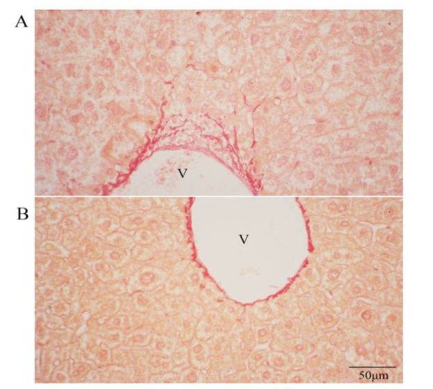 Figure 2: (A) Sirius red stained PCTRL liver sections. (B) Sirius red stained PRE liver sections. Note many fibers at the vicinity of the portal vein (V). 400X.