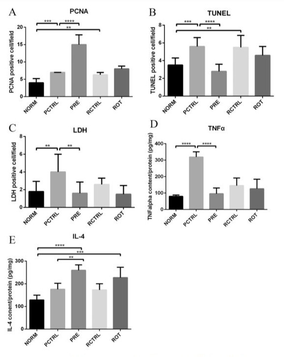 Figure 4: Graphs show quantification results of (A) PCNA IHC, (B) TUNEL, (C) LDH IHC, (D) TNFα ELISA and (E) IL-4 ELISA. Data are represented as mean ± SD, **P ≤ 0.01, ***P ≤ 0.001, ****p < 0.0001.
