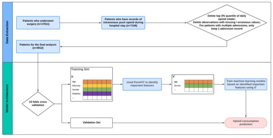 Existing predictive models for postoperative opioid consumption often adopt parametric techniques, which necessitate restrictive assumptions by explicitly specifying the functional association between predictors and postoperative opioid consumption [22,28,32]. These restrictive assumptions may not hold in clinical practice and are unverifiable [33,34]. Misspecification of the functional association format can lead to inaccurate predictions. Conversely, many machine learning methods developed in recent years relax many of these restrictive assumptions [35].In this study, we investigated the effectiveness of four commonly used machine learning models in predicting postoperative opioid consumption. Specifically, we compared Support Vector Machine (SVM), Extreme Gradient Boosting (XGBoost), Random Forest (RF), and Deep Neural Network (DNN) based on patients’ demographics, clinical, preoperative, and operative features [36-42]. While these machine learning models are robust in exploring complex associations, they lack transparency in evaluating each individual feature’s impact on postoperative opioid consumption due to the abstract algorithms used [43-45]. Identifying important features associated with postoperative opioid consumption helps strengthen our understanding of postoperative opioid consumption mechanisms and improves postoperative pain management for ICU surgery patients. To address transparency limitation of machine learning models, we adopted the permutation-based feature importance test (PermFIT) procedure [46]. The overall goal of this paper is to develop and validate a machine learning framework for accurate personalized postoperative opioid need prediction and identify the associated important features under complex associations based on ICU surgical patients’ Electronic Health Records (EHRs) captured in clinical practice.