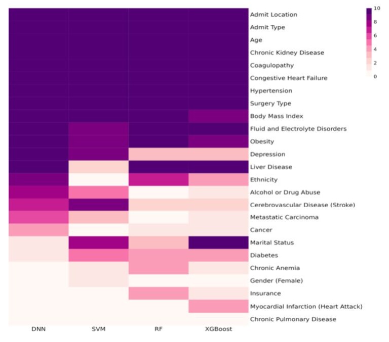 Using the permutation feature importance test framework, we identified the important features associated with postoperative opioid consumption for each machine learning model across each fold of 10-fold cross-validation. Figure 2 displays the heatmap of the frequency of identified important features for each machine learning method at a significance level of 0.05. It's evident from this figure that patient age and surgery type are consistently identified as significant factors for average daily postoperative opioid consumption across all 10 folds by all four machine learning methods. Moreover, sex, serum calcium, serum potassium, diabetes, admission type, alcohol abuse, and cerebrovascular disease/stroke were identified as significant factors associated with average daily postoperative opioid consumption across all 10 folds by the DNN model.