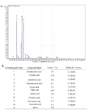 Figure 1a: The Integration Peak of PURO. The abscissa axis is counts vs Acquisition time. The y-axis is TIC Scan. Figure 1b: The composition and content of PURO. The ingredient of PURO is tetradecanoic acid (0.1%), palmitic acid (17.9%), palmitoleic acid (0.4%), heptadecanoic acid (0.1%), stearic acid (9.1%), oleic acid (36.5%), linoleic acid (33.1%), linolenic acid (1.1%), eicosanoic acid (0.7%), eicosenoic acid (0.2%), others (0.8%).