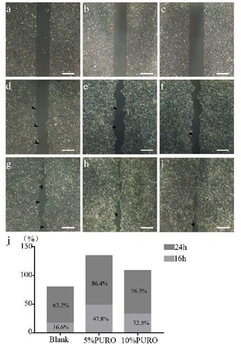 86.4%, 10% PURO treatment is 76.3% and the blank treatment is 63.2% (Figure 2j). These mean that the PURO can accelerate the cell migration and may have the function of wound healing and skin barrier.