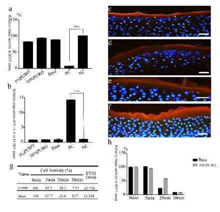 Figure 3a: The relative tissue activity of skin model with PURO formula treatment in MTT assay; Figure 3b : The relative expression of release of IL-1α with PURO formula treatment in skin model; Figure 3c and 3d: The Permeability of rhodamine B staining detected after 24h PURO formula and Base treatment of with SDS pretreatment; Figure 3e and 3f: The Permeability of rhodamine B staining evaluated after 24h PURO and Base treatment of with PBS pretreatment. The fluorescent images shown rhodamine B (red), DAPI staining (blue). The Bar= 50μm. Figure 3g: The ET50 data of 10% PURO formula and Base. Different treatment time has different tissue activity. The ET50 data calculate by SPSS. Figure 3h: The MTT assay of 10% PURO and Base with different treatment time.