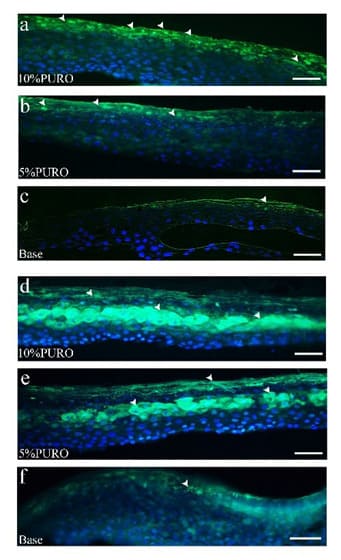 A commercial epidermal tissue is EpiSkin® (L’Oréal Research and Innovation Center, Shanghai, China), made from normal human keratinocytes. EpiSkin® which is an in vitro reconstructed human epidermis that culture on a collagen matrix at the air-liquid interface. EpiSkin ® are similar to those of in vivo human epidermis by histologic sections. After pre-incubation, tissues were treated with 0.3% SDS or PBS for 10 min. Then the tissues were washed by DPBS, as SDS damaged skin model or normal skin model. Then, the tissues exposure with 20 μl of various concentrations of PURO confect with Base material. After 24-48 h treatment, tissues were washed with DPBS.