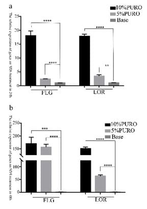 Here, we find that 10% PURO formula can improve the expression of LOR (Figure 7a and b). 5% PURO formula can improve the expression of IVL on normal skin model; the 10% PURO formula can rapidly improve the expression of LOR, IVL, FLG and CER3 on normal skin model (Figure 7). That means high concentration of PURO possibly raise the barrier, low concentration of PURO not as effective as high concentrations for repairing the skin barrier. For SDS-damaged skin model, both 5% PURO formula and 10% PURO formula can repair the skin barrier by improving the expression of FLG and LOR (Figure 4 and Figure 5), 10% PURO formula reducing skin permeability and lengthening the ET50 time (Figure 3). That means PURO can be used on people with sensitive skin to repair the skin barrier.