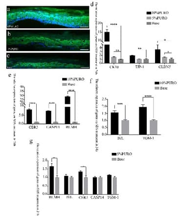 Figure 6a, 6b, 6c: The immunofluorescence staining of CK10 protein on 10% PURO, 5% PURO and Base treatment with location and intensity. The Bar= 50μm. Figure 6d: Quantitative RT-PCR analysis of CK10, TJP1 and CLDN5 in SDS damaged skin model with 10% PURO, 5% PURO formula and Base treatment on 24h. Figure 6e: Quantitative RT-PCR analysis of CER3, CASP14 and BLMH in SDS damaged skin model with 10% PURO formula and Base treatment on 24h. Figure 6f: Quantitative RT-PCR analysis of IVL and TGM-1 in SDS damaged skin model with 10% PURO formula and Base treatment on 24h. Figure 6g: Quantitative RTPCR analysis of CER3, CASP14, IVL, TGM-1 and BLMH in SDS damaged skin model with 5% PURO formula and Base treatment on 24h. The levels of CK10, TJP1, CER3, CASP14, IVL, TGM1, BLMH and CLDN5 were normalized to those of β-Acting and compared with those of Base.
