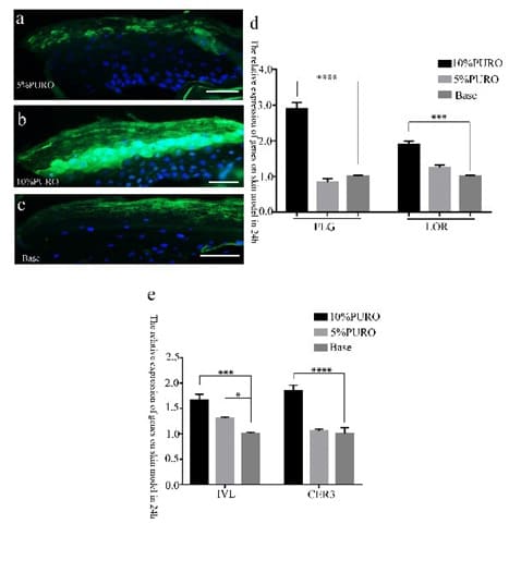 Figure 7a: The Immunofluorescence staining of LOR on normal skin model with 5% PURO formula treatment on 24h; Figure 7b: The Immunofluorescence staining of LOR on normal skin model with 10% PURO formula treatment on 24h; Figure 7c: The Immunofluorescence staining of LOR on normal skin model with Base treatment on 24h; The Bar= 50 μm. Figure 7d: Quantitative RT-PCR analysis of LOR and FLG in normal skin model with 10%PURO, 5% PURO formula and Base treatment on 24h. Figure 7e: Quantitative RT-PCR analysis of IVL and CER3 in normal skin model with 10%PURO, 5% PURO formula and Base treatment on 24h. The levels of FLG, LOR, IVL and CER3 was normalized to those of β-Acting and compared with those of Base.