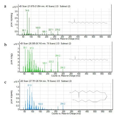 Figure S1a : The molecular formula and mass-to-charge of palmitic acid; Figure S1b: The molecular formula and mass-to-charge of oleic acid; Figure S1c: The molecular formula and mass-to-charge of linoleic acid.