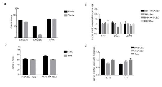 Figure S2a : The tissue activity of skin model that treated with 0.2% SDS 10min and 20min,0.3%SDS 10min and 20min. Figure S2b : The tissue activity of skin model that pretreated with 0.3%SDS 10min, the exposure with 1%PURO formula and 5% PURO formula.Figure S2c: Quantitative RT-PCR analysis of CK14, DSG1 and AQP3 in damaged and normal skin model treated with PURO formula on 24h; Figure S2d: Quantitative RTPCR analysis of IL-1α and IL-8 in normal skin model. The levels of CK14, DSG1, AQP3, IL-1α and IL-8 were normalized to those of β-Acting and compared with those of Base.