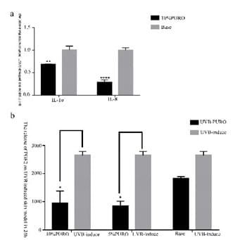 As the previous results, we can confirm that PURO have the function on repairing the damaged skin and increasing skin barrier. As we all know, the dysfunctional skin barrier, typically Atopic Dermatitis (AD) also causes an inflammatory response in the skin [36]. Furthermore, we want to explore whether PURO have function on anti-inflammatory. When the keratinocyte (KC) is damaged, it will release IL-1, which essentially is a primary event in skin defense. IL-1 also stimulates the production and release of IL-6, IL-8 and GM-CSF from the neighboring KC [37]. UV irradiation is a potent inducer of cyclooxygenase (COX)2 enzyme and produces high levels of PGE2 in the skin [38]. Here, we use QRT assay to detect the expression of IL-1α and IL-8. We find that PURO have no effect to IL-1α and IL-8 on normal skin model (Figure S2d). This suggest that PURO cannot cause inflammation on skin model which may imply its safety. The QRTPCR analyze show that the relative expression of IL-1α and IL-8 are significant down-regulate after treated with high concentration of PURO on SDS-damaged skin model (Figure 8a). Then, we use UVB to induce and damage the skin model and detect the PGE2 release. The result shows that both 5% PURO and 10% PURO significantly inhibited the release of PGE2 on UVB-induced skin model (Figure 8b). That means PURO may have the function on anti-inflammatory in skin model.