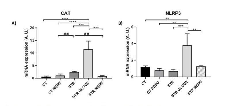 Catalase (CAT) showed increased expression in STR GLOVE (13.86 ± 4.303) p<0.0001, while STR REIKI showed decreased expression and NLRP3 (Nod-like receptor protein 3) was significantly reduced in STR REIKI (0.4783 ± 4.617) p 0.009, in STR GLOVE it showed increased expression (5.109 ± 1.102) p 0.001 compared to the stress group (Figure 2).