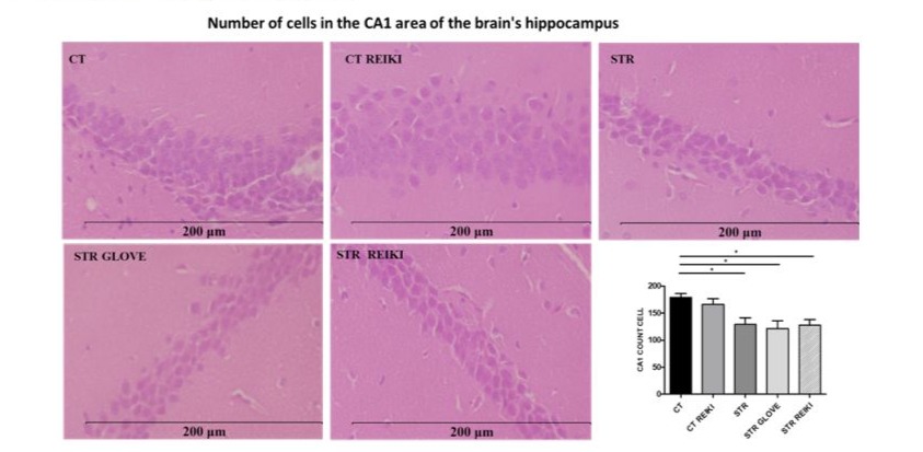 The hippocampal cell area in the CA1 region was reduced in the STR groups compared to the CT groups. In addition, there was a statistical difference between the CT and STR groups (0.5599 ± 99.76) p< 0.012, CT and STR GLOVE (8.000 ± 107.2) p<0.01 and CT and STR REIKI (1.510 ± 100.7) p< 0.004 (Figure 3).