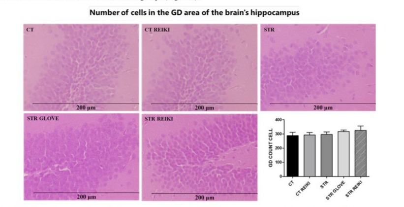 Chronic stress in mice has also been linked to a reduction in adult neurogenesis in the dentate gyrus (GD), the main region where new neurons are generated throughout life [75-77] that may be missing in the CA1 area of the hippocampus [78,79]. Some possibilities could elucidate this occurrence, such as the number of injured cells must be quantitatively higher when compared to the newly generated cells and also because the generated neurons probably do not become mature enough and thus are not neurophysiologically functional [80]. Stressed animals can induce microglial priming in GD, which is related to a hyperimmune response to stress and altered hippocampal neurogenesis [81]. In this study, there was an increase in the GD region after reiki treatment, which may support the hypothesis of an association between greater neurogenesis and lower signs of depression and stress.