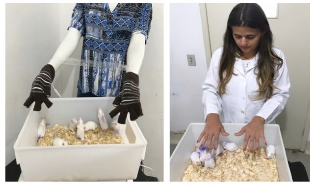 In the Control-Glove group, the following technique was performed: for 15 minutes, during 51 consecutive days, a pair of gloves connected to a portable battery, heated, filled with cotton, attached to a mannequin about one meter away, were placed on each of the boxes of the animals in this group.