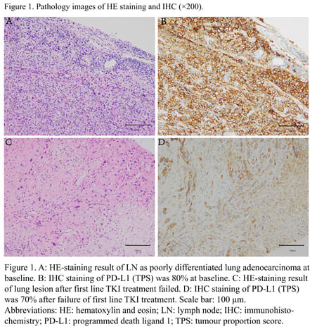 However, after 10 months of TKI therapy, she underwent progressive disease (PD) due to the enlarged primary lung lesion and multiple brain metastases. Then, the lumbar puncture was performed, without any tumor cells in the cerebrospinal fluid (CSF). However,PD-L1 of lung tissue in second biopsy reduced from 80% to 70%(Figure 1D). And the lung biopsy showed poorly differentiated carcinoma (Figure 1C). NGS of blood and CSF still showed CD74-ROS1 rearrangement, TP53 mutation and TERT mutation. Besides, a FGFR3 amplification was found in CSF but not in blood (Table 1).